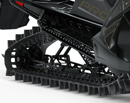 Задняя подвеска PRO RMK имеет сбалансированную, оптимизированную геометрию и конструкцию направляющих, которые передают всю мощность непосредственно на снег, чтобы уверенно двигаться вперед. Жесткая конструкция позволяет точно удерживать траекторию движения даже на самой сложной местности. Длина гусеницы 155 дюймов.
